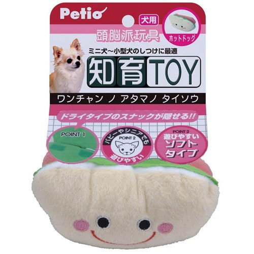 ●噛む力の弱いワンちゃんでも遊べる、ソフトタイプの知育トーイ。ドライタイプのスナックを使って、遊び方は工夫次第。笛入りで楽しいよ。ホットドッグ型。